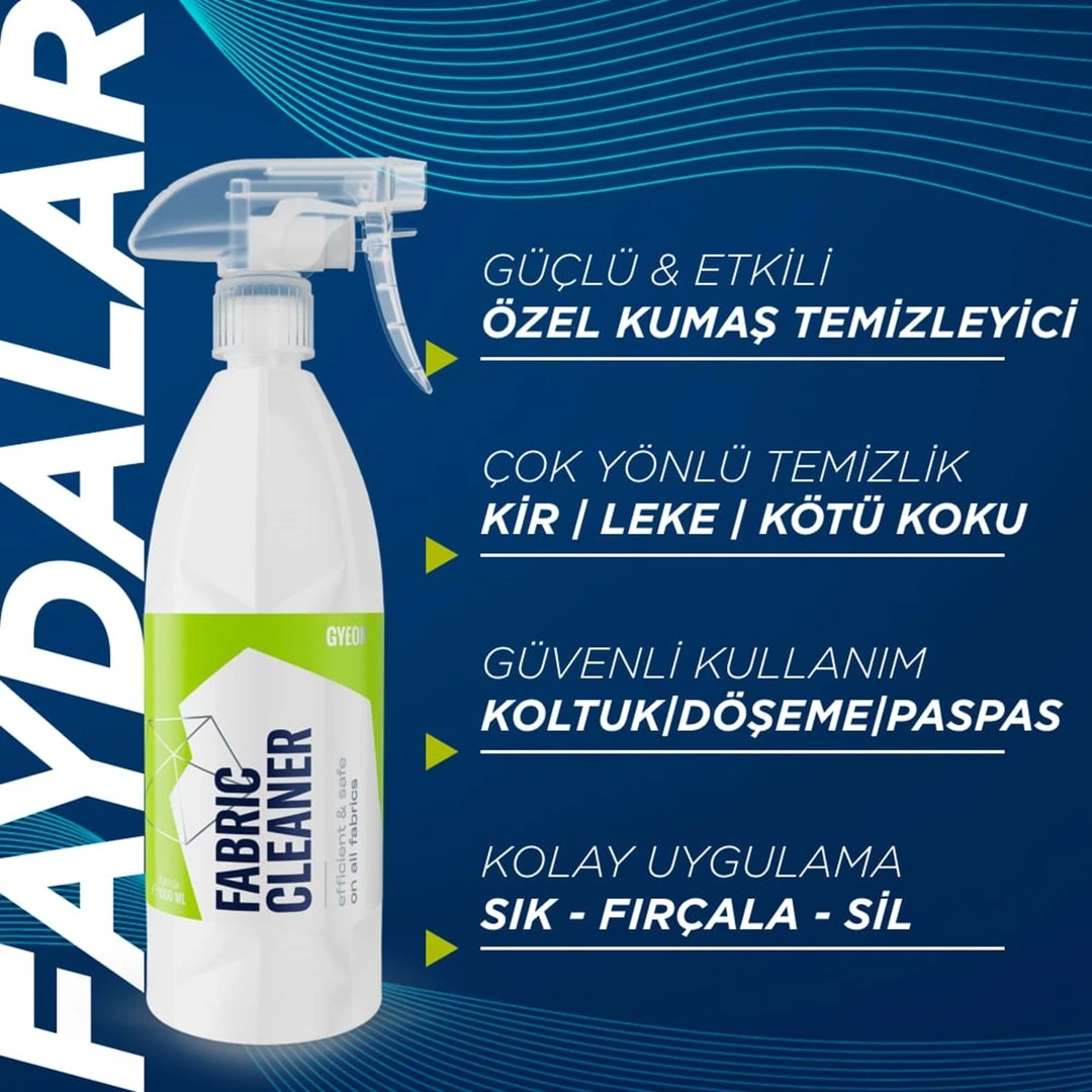 GYEON Q²M FabricCleaner, kumaş koltuk, paspas, döşeme ve kumaş tenteler için derinlemesine bir temizlik sağlar. Tüm kumaş çeşitlerinde ağır kirleri, lekeleri ve kötü kokuları ortadan kaldırmak için özel olarak formüle edilmiştir. Uygulama sonrasında tertemiz taze ve yenilenmiş bir yüzey bırakır.