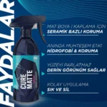 GYEON Q²M Cure Matte REDEFINED, geliştirilen yeni formülü ile orjinal mat boyalar ve mat PPF film folyo kaplamalı araçlar için benzersiz, yenilikçi, seramik bazlı bir bakım spreyi olarak tasarlanmıştır. Kaplamaların dayanıklılığı uzatır. Yüzeyleri parlatmadan, renk derinliğini ve yoğunluğunu artırır.