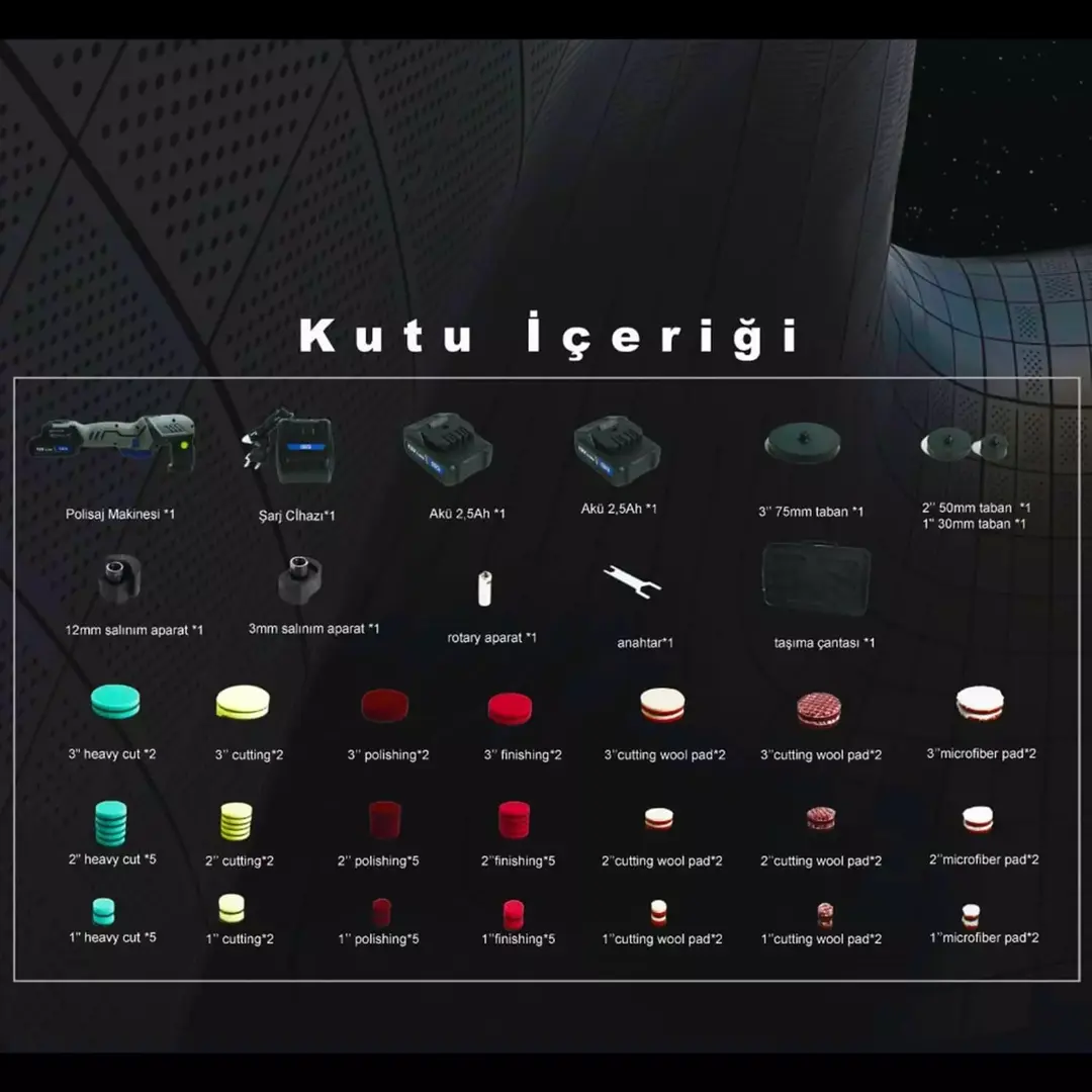 • Zengin Aksesuar Seti: Çeşitli pedler, keçeler, tabanlıklar, salınım aparatı, şarj cihazı, taşıma çantası ve 2 adet aküyle tam donanımlı bir çözüm sunar.